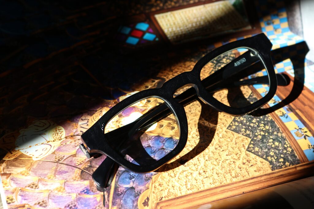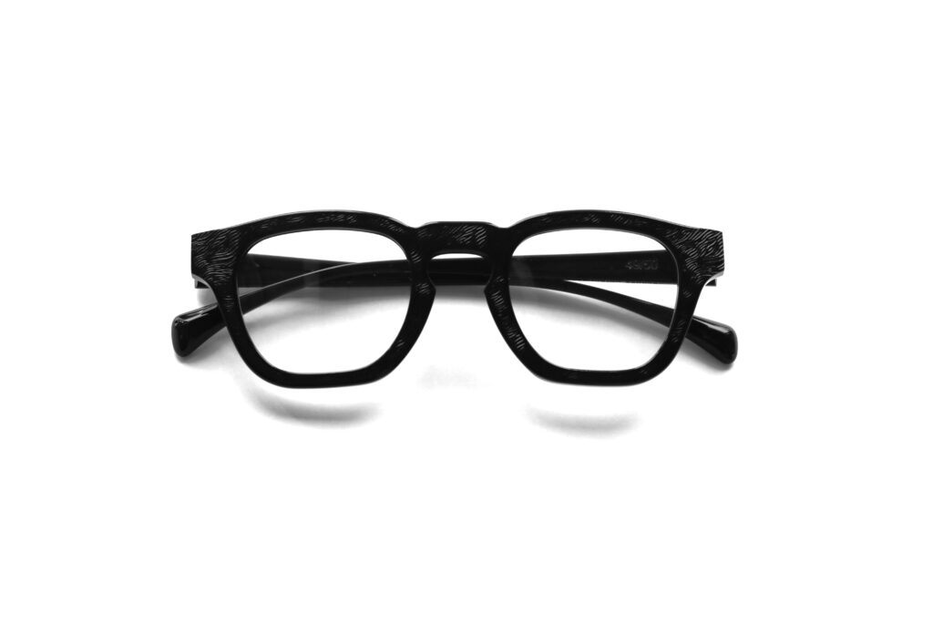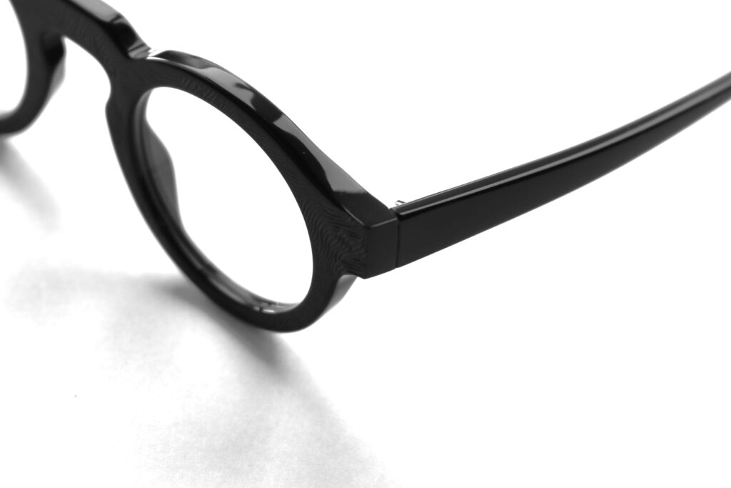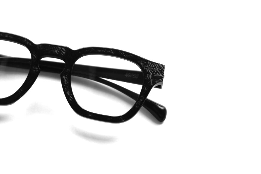 ブラックアセテートに存在感のある質感が新鮮なエンボス加工を施した、特別なマテリアルはイタリア・マツケリ社製。
