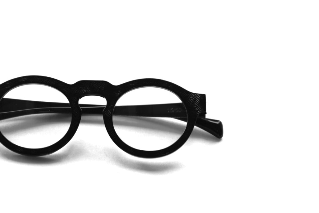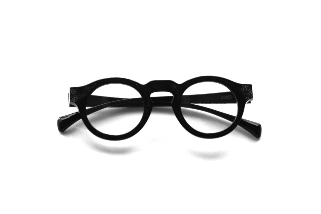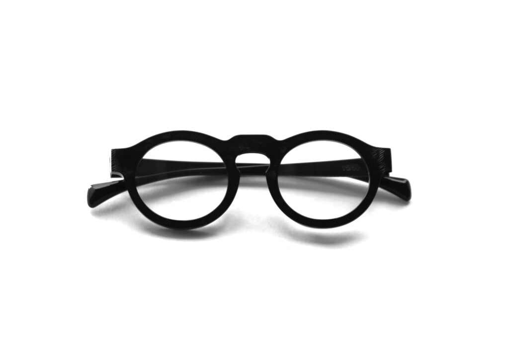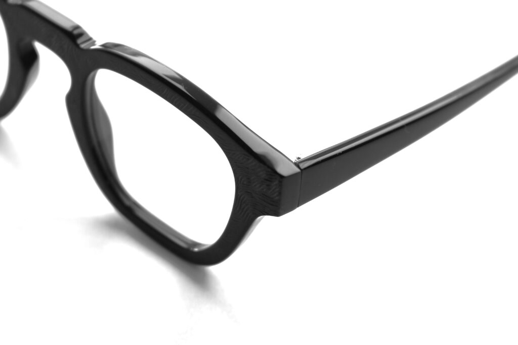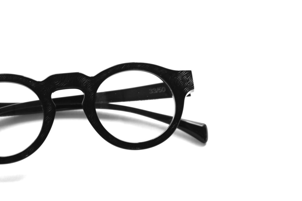 ブラックアセテートに存在感のある質感が新鮮なエンボス加工を施した、特別なマテリアルはイタリア・マツケリ社製。