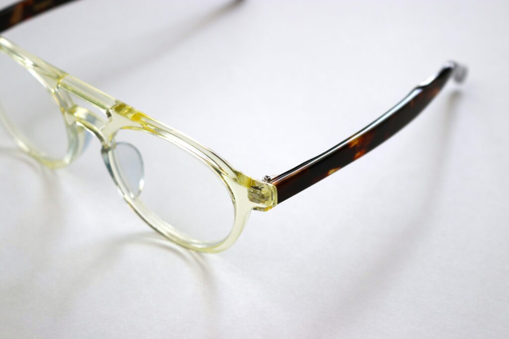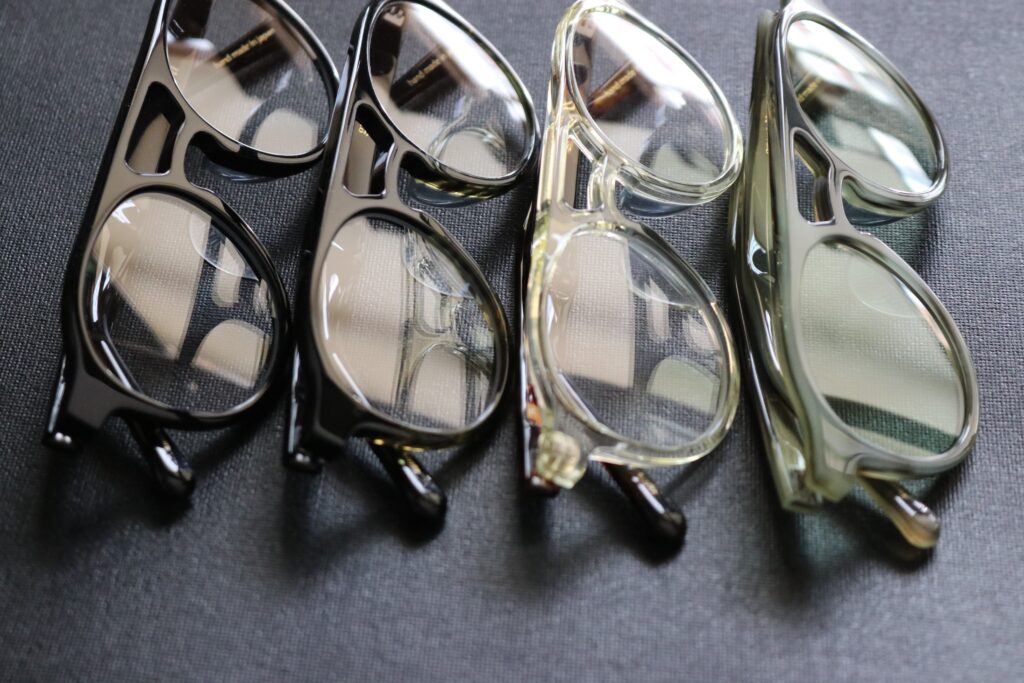 眼鏡産業のいち時代を支えた職人技を後世に残したいという思いのもと、すべての眼鏡に用いたセルロイド製のパーツ。