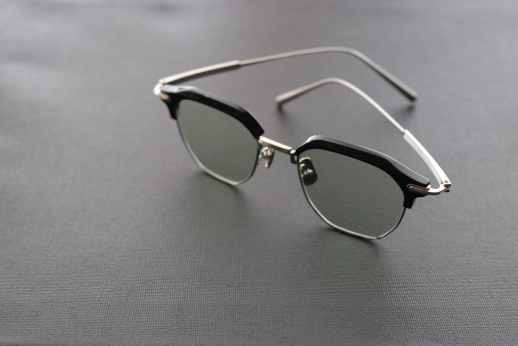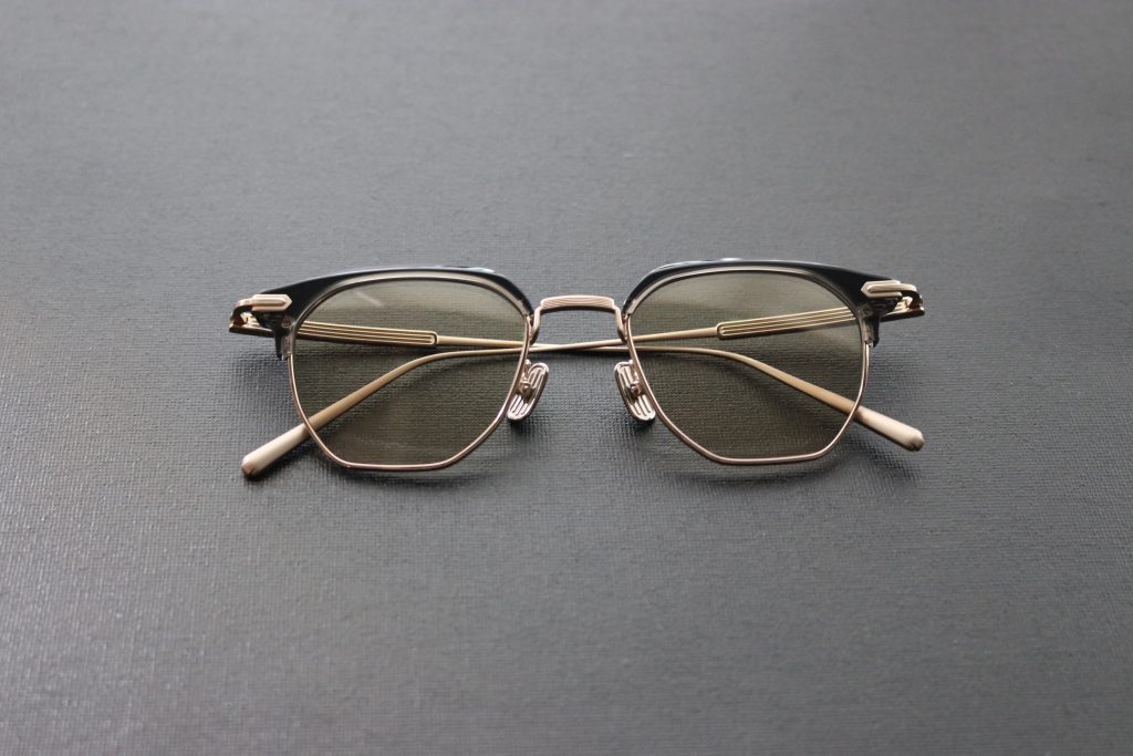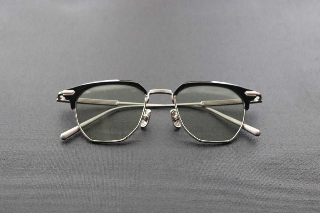 また、縦横だけでなく斜めにもカッティングが施されたアセテート製ブロー部の形状とチタン製フレームのコンビネーションは変形の多角形(オクタゴン)スタイルとしてまとめられ、直線的ながら柔らかさとオーセンティックさを感じられるデザインに仕上げられています。