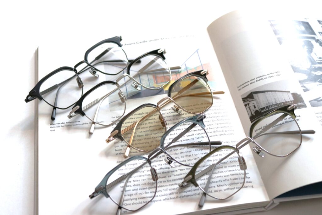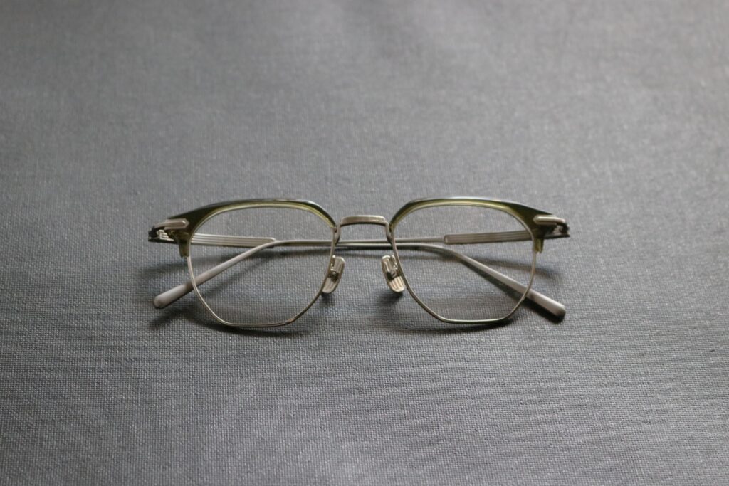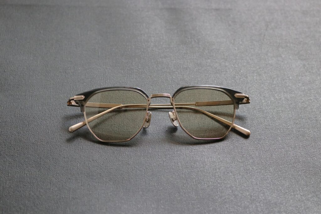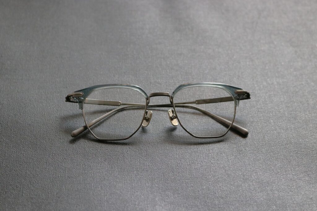 また、縦横だけでなく斜めにもカッティングが施されたアセテート製ブロー部の形状とチタン製フレームのコンビネーションは変形の多角形(オクタゴン)スタイルとしてまとめられ、直線的ながら柔らかさとオーセンティックさを感じられるデザインに仕上げられています。