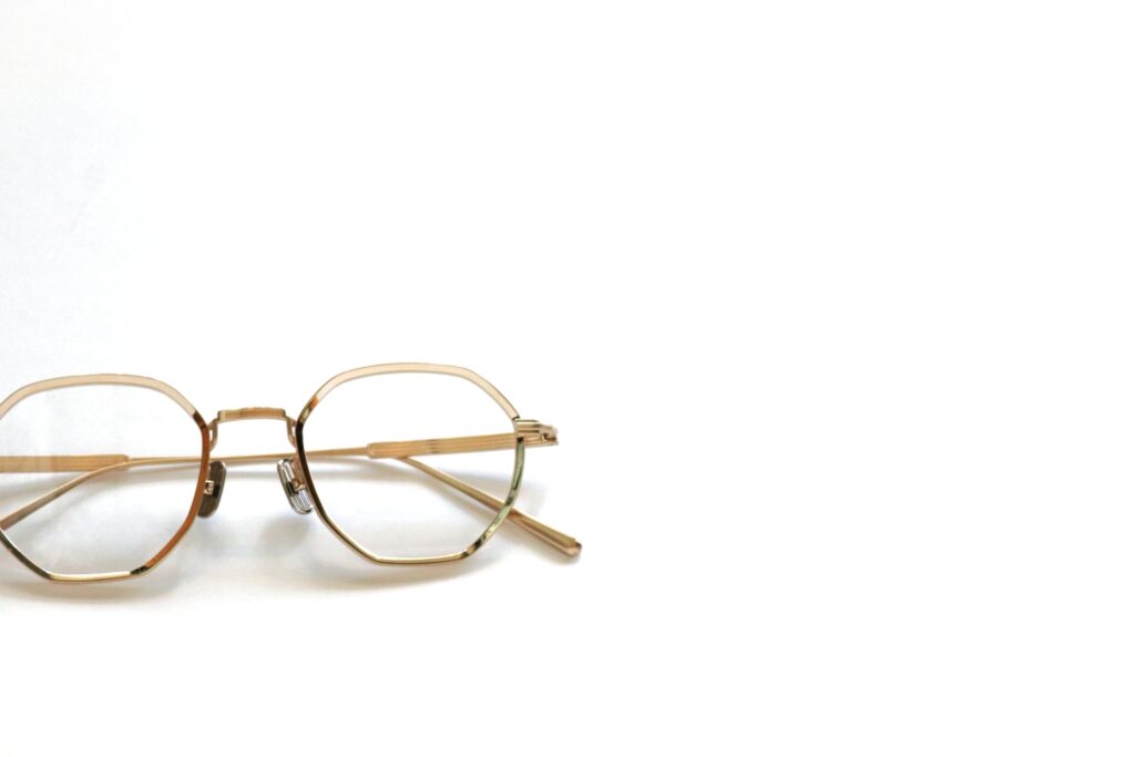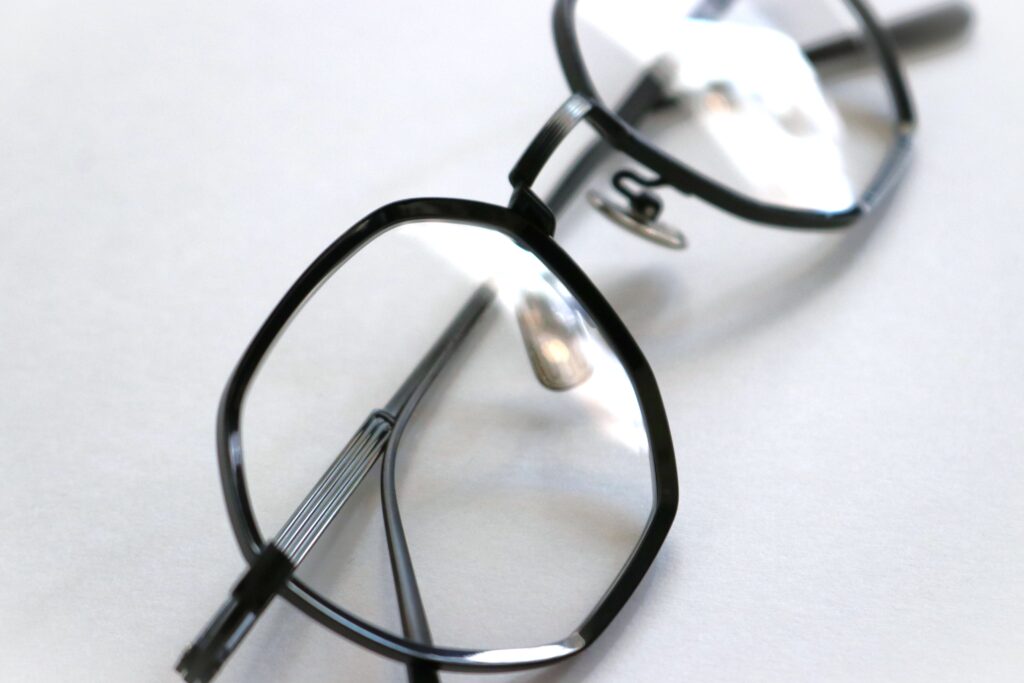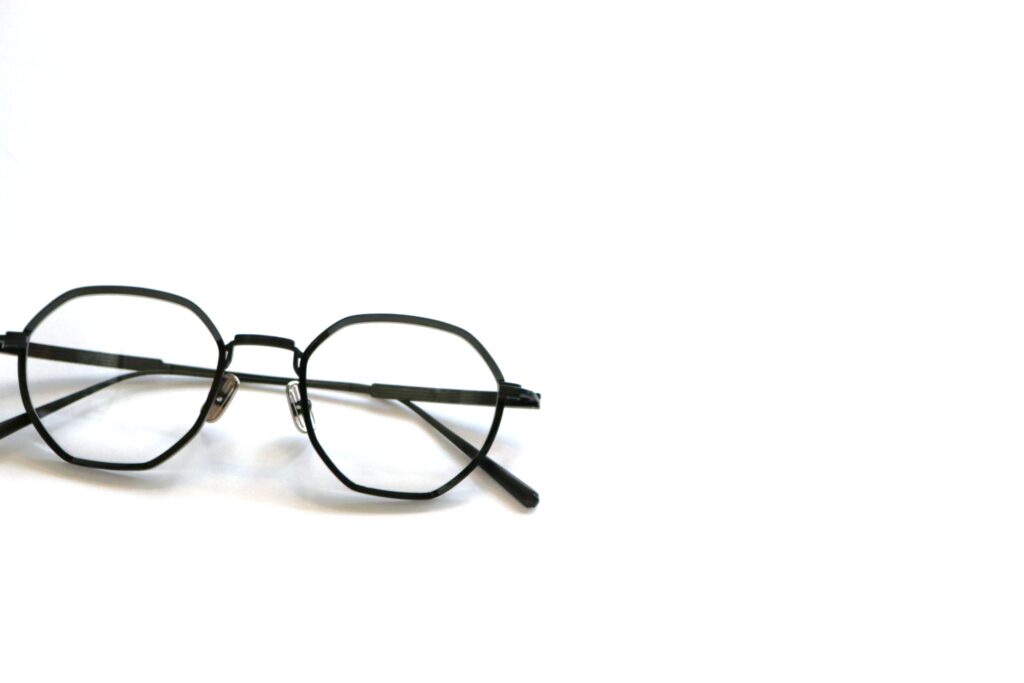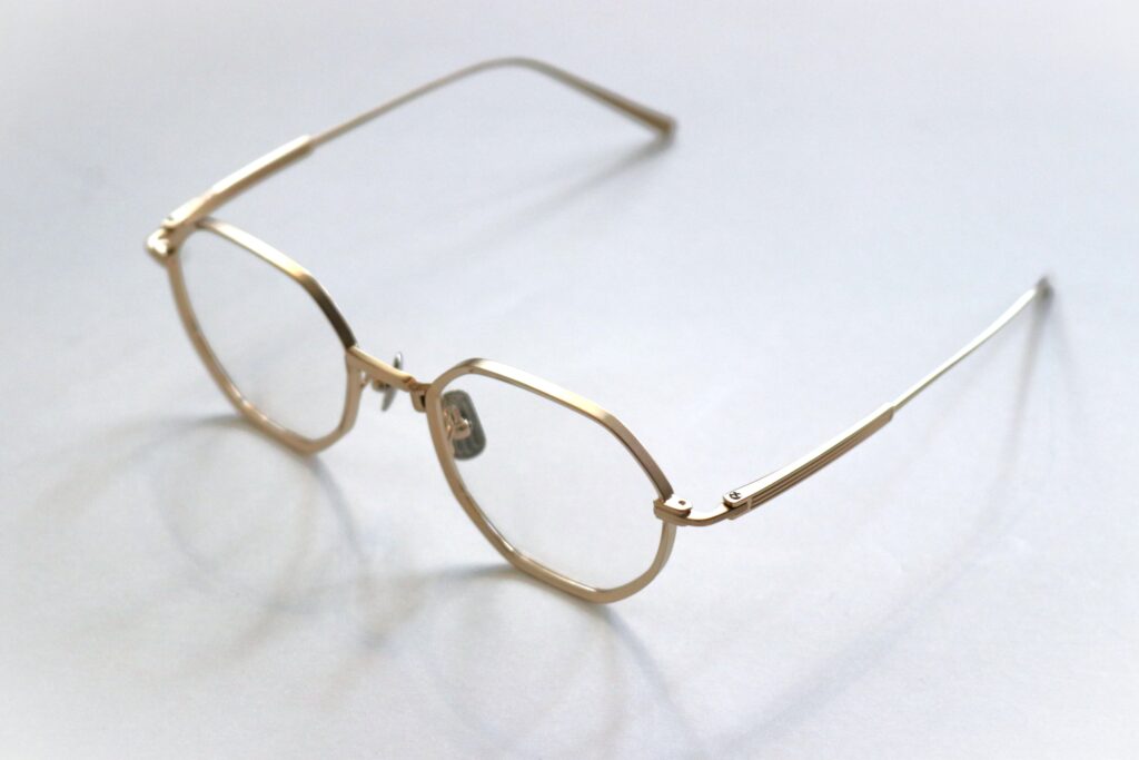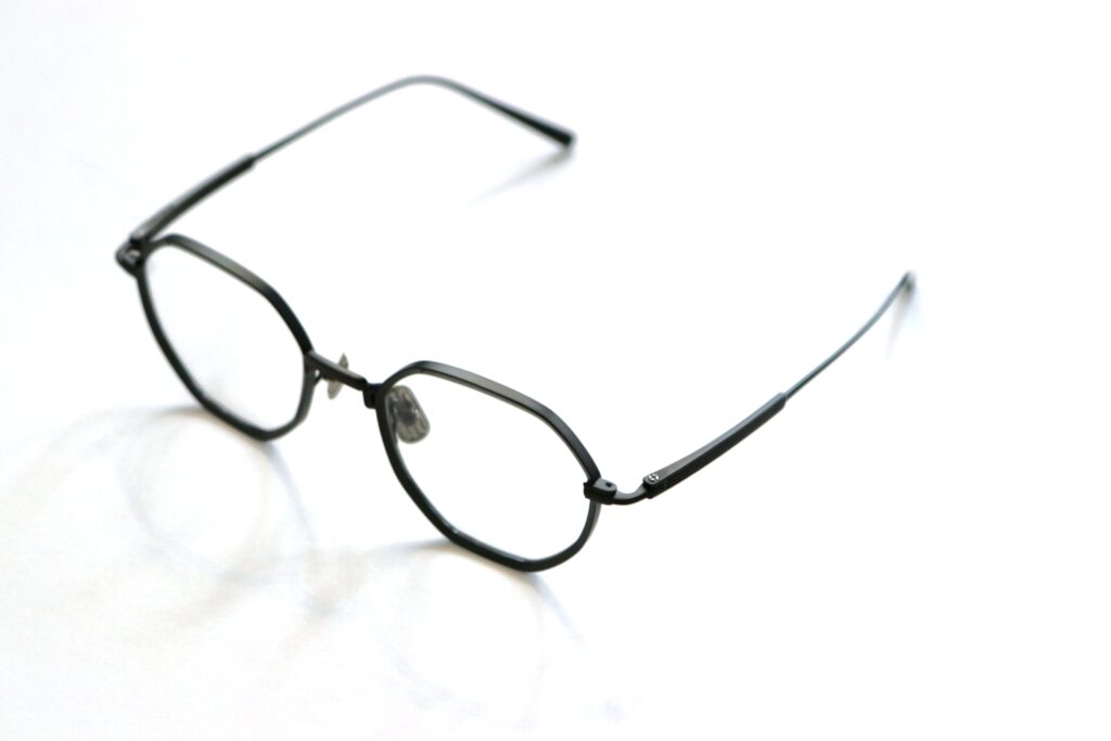通常のメタルフレームとは異なり、シート状の厚チタンを板抜きしたリムを作製し、そこに斜めにカッティングを入れる 通称 “テレビジョンカット” を施すことで、光の陰影によるコントラストによって奥行きのあるシルエットを作り出しています。