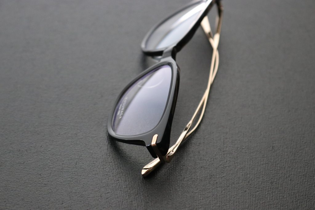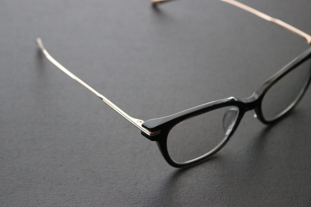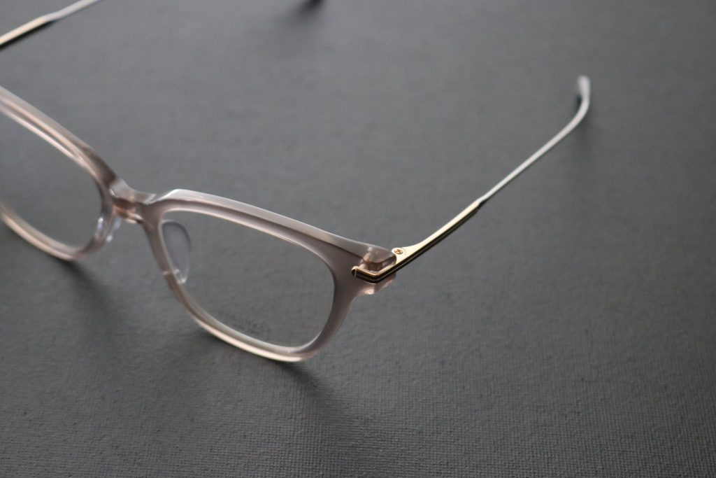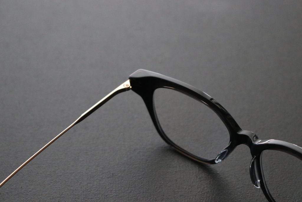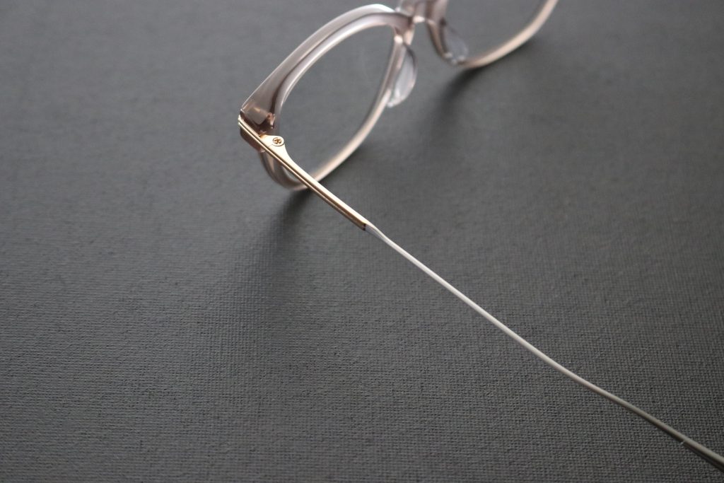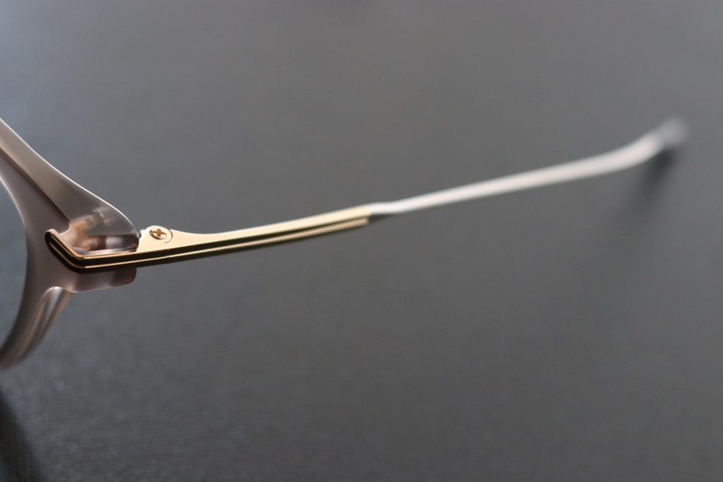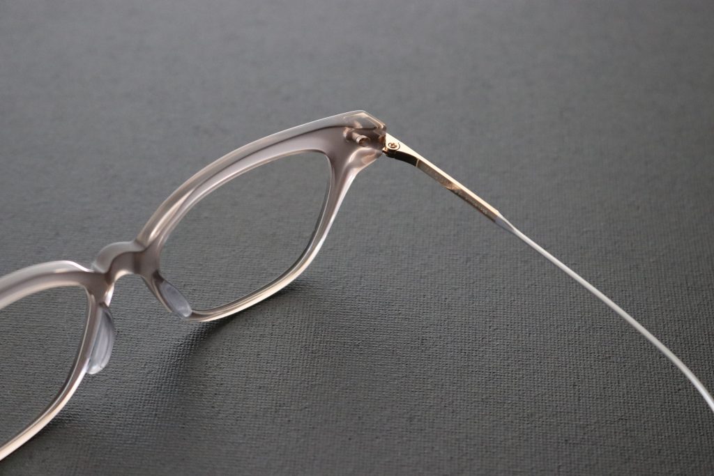 フロントはアセテート製プラスチックに、ヨロイからテンプルにかけてのチタニウム製パーツを組み合わせたコンビネーションフレームです。