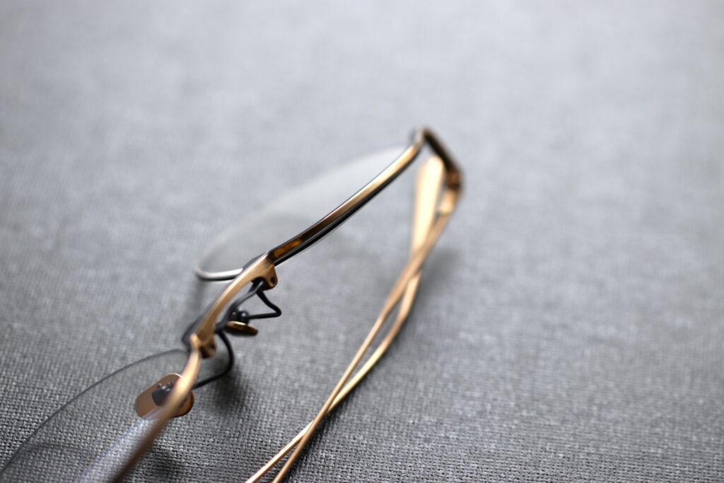 レンズを留めるリムフレームは一枚のβチタンプレートから製作された左右一体パーツにすることで、破損などの弱点となりやすく硬さが生まれる接合部分がないため強度アップとレンズ保護のためのしなやかさに貢献します。