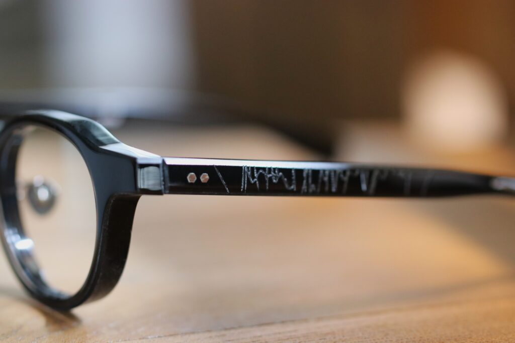 また、フロントからテンプルには角を削ったような荒々しさのある仕上げや、心電図の波形をイメージした刻みラインが施されたテンプル側面など、芸術的な側面も表現されています。