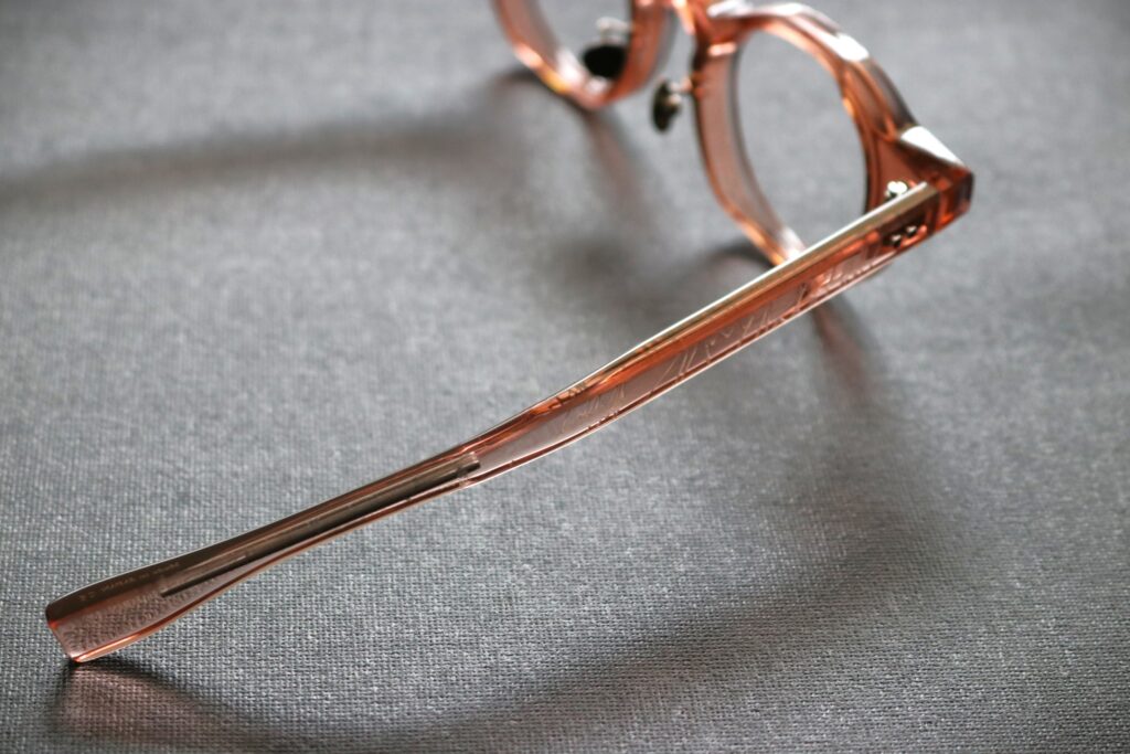 テンプルはセルロイド製ならではのノー芯の技法を用いながら、耳に掛かる部分には補強と固定を目的とした芯金を備えています。